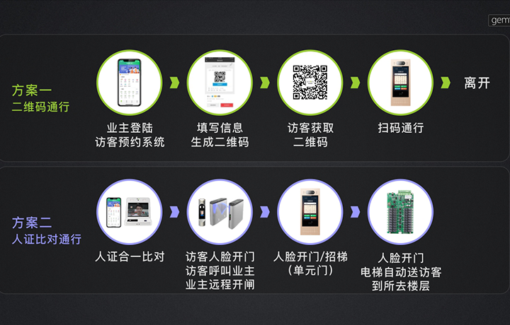 優(yōu)化體驗:訪客可通過業(yè)主所發(fā)二維碼無感通行社區(qū)出入口、單元樓門口,亦可通過人臉識別道閘呼叫業(yè)主開閘,實現(xiàn)無感通行社區(qū)出入口、單元樓門口,人臉招梯至業(yè)主所在樓層。