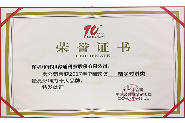 君和睿通秉承“科技成就生活之美“的品牌理念,一直致力于打造值得客戶信賴的行業(yè)領(lǐng)先品牌,以高品質(zhì)、優(yōu)服務(wù)回饋市場的支持與認(rèn)可。君和睿通本著以產(chǎn)品為企業(yè)核心價值導(dǎo)向,通過產(chǎn)品技術(shù)、品質(zhì)、服務(wù)的變革升級,為客戶提供“智能化、人性化、專業(yè)化”的產(chǎn)品服務(wù)。本次喜獲“2017年樓宇對講最具影響力十大品牌”也是從另一方面體現(xiàn)出客戶對君和睿通的認(rèn)可和喜愛。